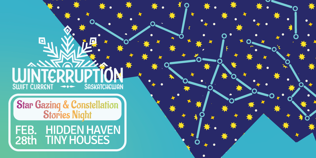Join us for a free night of star gazing, story telling, and hot drinks on February 28th 7pm-9pm at Hidden Haven Tiny Houses and Nordic Spa just south of Swift Current on the #4 highway. Learn about the constellations and the myths and legends associated with them, plus if the skies are clear, get a chance to see the sky through a telescope guided by local astronomy enthusiasts. There will be hot drinks and a warming house available. Free for all ages! All attendees will receive a surprise from Hidden Haven Tiny Houses & Spa.